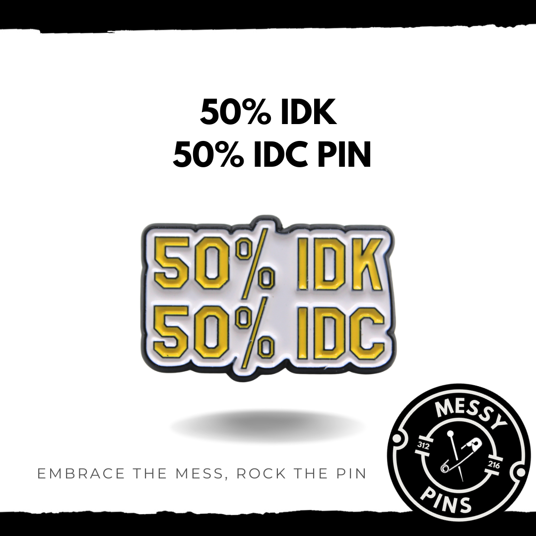 Feeling torn between confusion and indifference? This pin is not just a conversation starter; it's a badge of honor for anyone who lives in the delightful gray area of life. Embrace your wonderfully ambivalent attitude with this cheeky pin! Featuring a crisp white background with bold black text outlined in sunny yellow, the phrase "50% IDK, 50% IDC" captures that delightful mix of uncertainty and carefree nonchalance we all know too well. Whether you're navigating life's most perplexing questions or simply shrugging off the drama, this pin is your stylish companion.