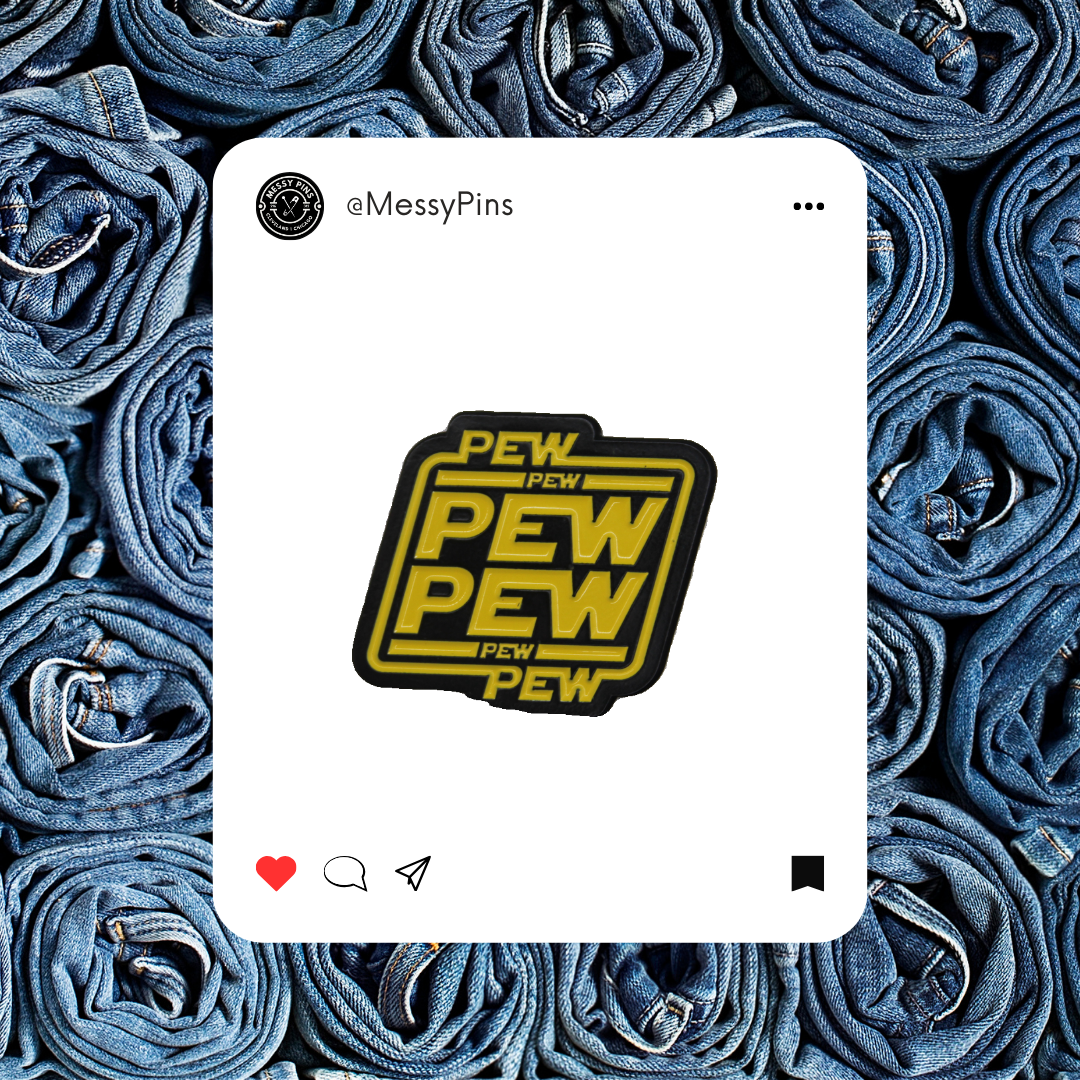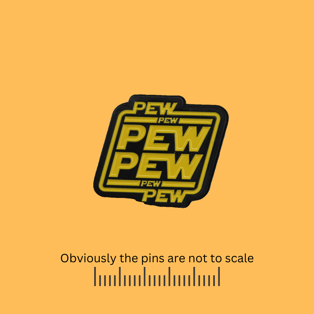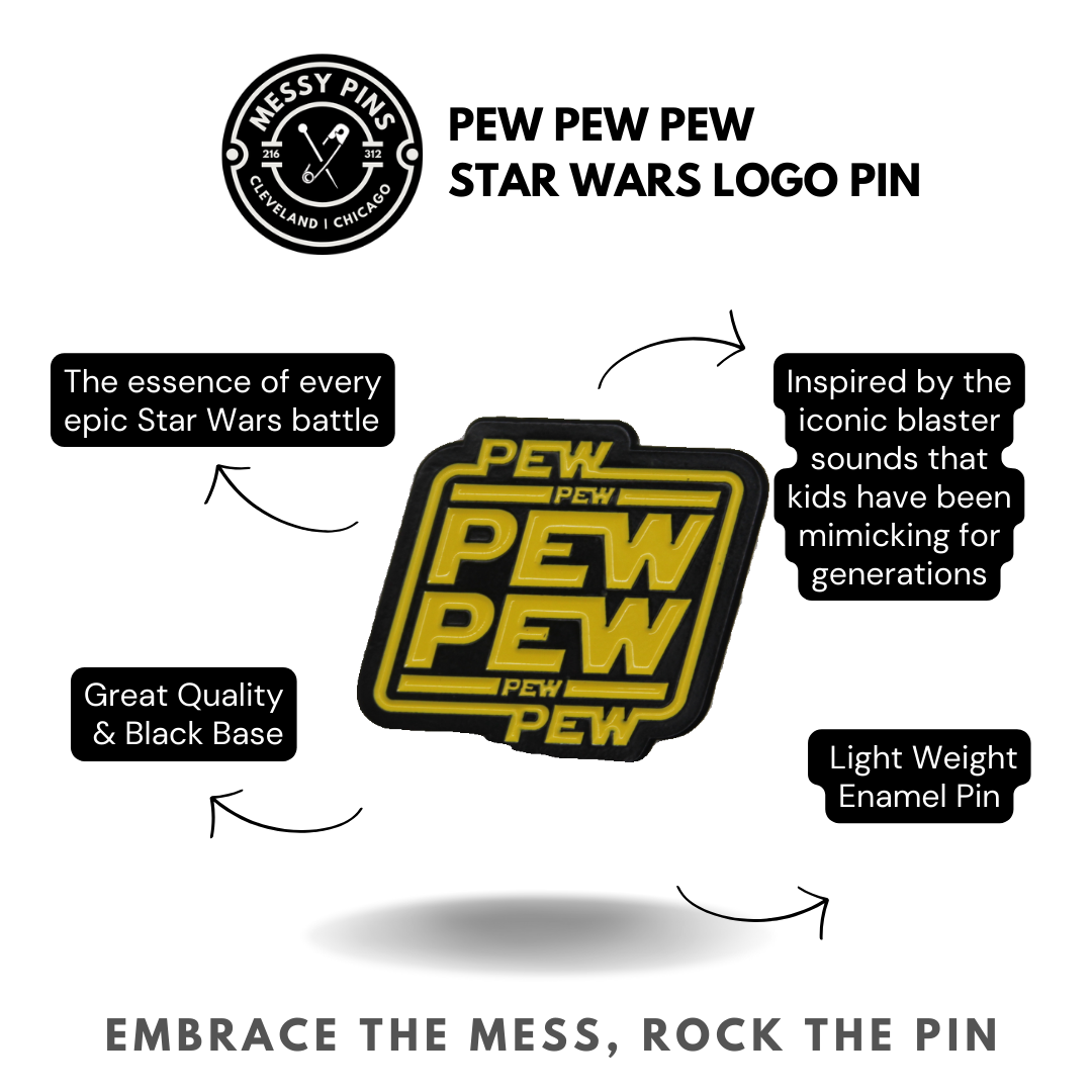 Unleash your inner blaster hero with the "Pew Pew Pew Star Wars Logo" Pin! This black and yellow pin on a sleek black base captures the essence of every epic Star Wars battle. This pin pays homage to the legendary sci-fi battles that made "pew pew" a universal sound. Inspired by the iconic blaster sounds that kids have been mimicking for generations, this pin is a nod to the legendary sound design that brought a galaxy far, far away to life.